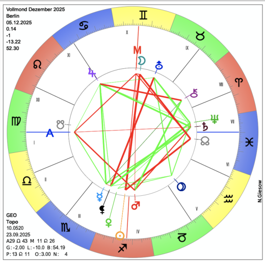 Am 5. Dezember stehen sich die Sonne im Schützen und der Mond in den Zwillingen im 14. Grad zum Vollmond gegenüber. Der Vollmond ist der Höhepunkt des 29 Tage dauernden Sonne-Mond-Zyklus. Er bringt die Themen der Zeit in die Sichtbarkeit, Spannungen und Möglichkeiten werden offenkundig. Beim Vollmond in den Zwillingen, der in der Adventszeit einen Tag vor Nikolaus stattfindet, geht es um Wissen und Erkenntnis. Inwieweit nutzt uns das viele Wissen (Medien, Internet, KI), inwieweit bringt es uns wirkliche Erkenntnisse, fördert unsere Selbsterkenntnis. Das sind wesentlichen Fragen, die bei diesem Vollmond aufgeworfen werden. Die Sonne im Schützen wird umrahmt von Venus und Mars, die sich auch beide im Schützen befinden. Damit spielt auch das Beziehungsthema eine wichtige Rolle beim Vollmond. Es geht dabei um die Integration von weibliche und männlichen Eigenschaften, Energien und Kräften. Der Vollmond kann uns zeigen, wo wir hier individuell und kollektiv wirklich stehen zur Zeit. Das Trigon von Mars zu Chiron und das von Merkur zu Jupiter fördern die Chancen auf Heilung, Integration und Erkenntnis.