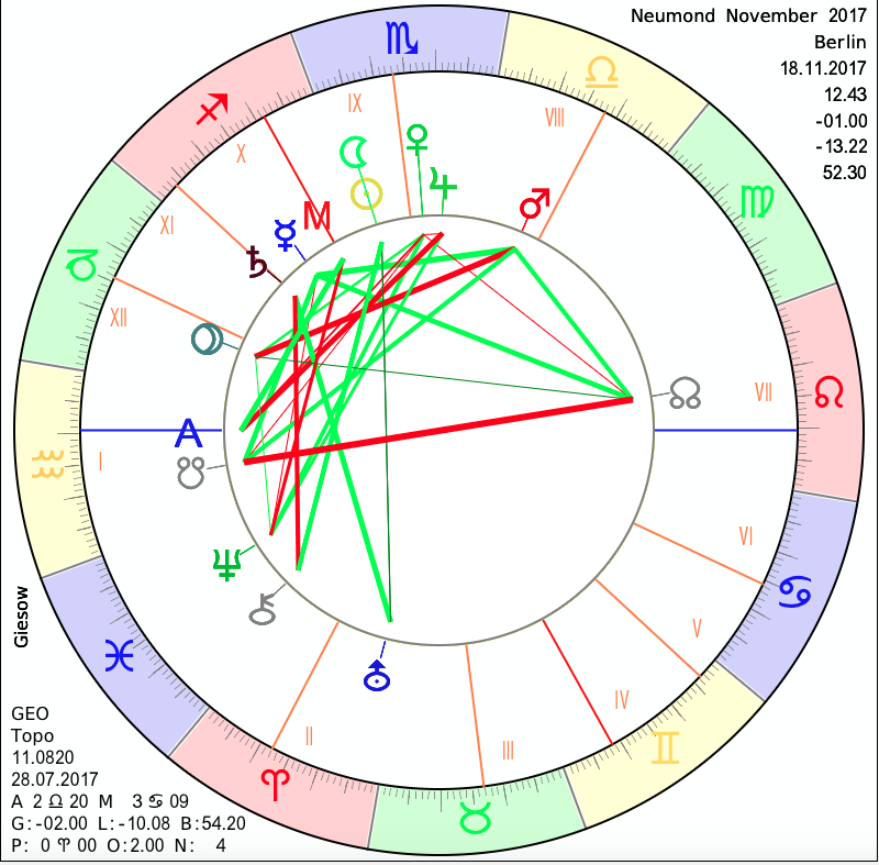 Am 11. November steht Saturn im Schützen im Trigon zu Uranus im Widder. Im Mai 2017 habe ich dazu geschrieben: „Am 19. Mai stehen Saturn im Schützen und Uranus im Widder im Trigon zueinander. Dieser Aspekt gilt als harmonisch, da er zwei Zeichen gleichen Elements (hier das Feuer) miteinander verbindet. Dreimal innerhalb eines Jahres zwischen Ende 2016 und 2017 ist dieser Aspekt exakt. Das erste Trigon war bereits am 25. Dezember 2016, das dritte und letzte kommt am 11. November 2017. Der harmonischer Aspekt zwischen Saturn und Uranus in Feuerzeichen verbindet Struktur und Verantwortung (Saturn) mit Innovation und Befreiung (Uranus). Damit ist die Möglichkeit gegeben, Veränderungen sanft und nachhaltig durchsetzen zu können. Das gilt sowohl für uns individuell wie auch kollektiv.“