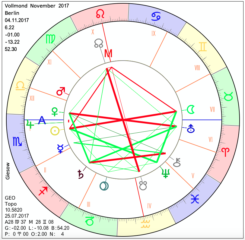 Am 4. November stehen sich die Sonne im Skorpion und der Mond im Stier im 12. Grad zum Vollmond gegenüber. Venus steht in Opposition zu Uranus, Jupiter und Merkur befinden sich auch im Skorpion. Beim Vollmond im Skorpion geht es darum, tiefgreifende, auch die Sinne betreffende Wandlung zu vollziehen. Es geht um den Gegensatz der inneren (geistigen und emotionalen) und der äußeren Welt. Mit unseren Trieben und Wünschen geraten wir immer wieder in Widerstand mit der äußeren Welt. Wir können in den Tagen um den Vollmond unsere „Machtlosigkeit“ erkennen, aber auch unsere Möglichkeit, uns in unserem Inneren zu wandeln. Wir möchten gleichermaßen Intensität (Skorpion) und Freiheit (Venus/Uranus) leben, was unter Umständen eine Veränderung oder einen Verzicht bedeuten kann.