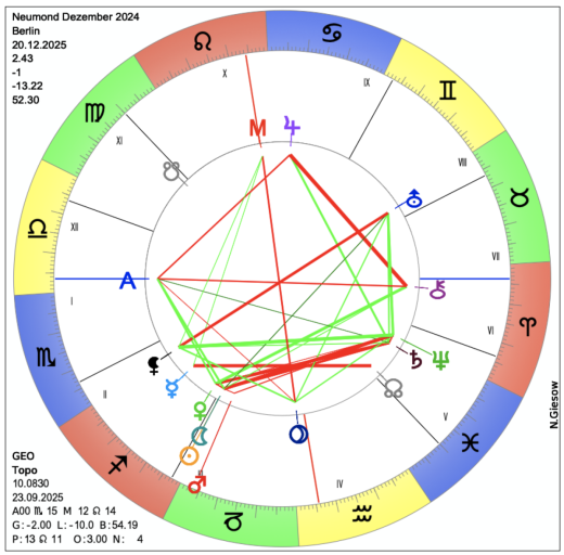 Am 20. Dezember treffen sich Sonne und Mond im 29. Grad des Schützen zum letzten Neumond in diesem Jahr. Damit endet der alte und ein neuer 29 Tage dauernder Sonne-Mond-Zyklus beginnt. Jetzt werden die Samen für zukünftige Entwicklungen gelegt. Etwas wird gezeugt, was später offenbart werden wird. Der Neumond steht im Quadrat zu Saturn und Neptun, die beide in die Fische zurückgelaufen sind. Es geht um Erkenntnisse, um Selbsterkenntnis, insbesondere was die Energien der vergangenen Zeit anbelangt. Was haben wir daraus gelernt, was können wir daraus für die neue Zeit mit dann neuen Energien mitnehmen. Wie weit sind wir mit unseren spirituellen Entwicklung. Denken, fühlen und handeln wir nur für uns, für unsere eigene Befriedigung oder beziehen wir andere Wesen mit ein („mögen alle Wesen glücklich sein und in Frieden leben“). Venus steht im Schützen im Quadrat zu Saturn in den Fischen, damit werden auch unsere Beziehungen und Werte kritisch übergeprüft. Ein starker Mars im Steinbock kann uns helfen die notwendige Disziplin und das Beharrungsvermögen aufzubringen, das Heilsame in unserem Leben aktiv anzugehen. Auch Heilung, sowie die Integration dessen, was nicht heilbar ist, steht durch das Quadrat zwischen Jupiter und Chiron im Fokus dieses intensiven Neumondes.