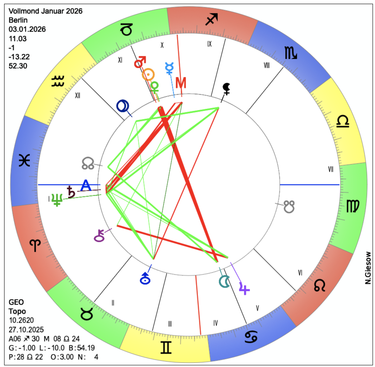 Am 3. Januar stehen sich die Sonne im Steinbock und der Mond im Krebs im 14. Grad zum Vollmond gegenüber. Der Vollmond ist der Höhepunkt des 29 Tage dauernden Sonne-Mond-Zyklus. Er bringt die Themen der Zeit in die Sichtbarkeit. Spannungen werden so sichtbar, aber oftmals auch deren möglichen Lösungen. Neben der Sonne stehen auch Merkur, Venus und Mars im Steinbock. Die Sonne befindet in enger Konjunktion mit Venus und mit Mars. Neben den Steinbock Themen wie Verantwortung, Vorausplanung, Beruf und Berufung spielen damit auch Beziehungsthemen eine große Rolle. Der Vollmond im Krebs verdeutlich den Gegensatz zwischen Beruf und Familie, zwischen Rationalität und Emotionalität. Auch wenn bei diesem Vollmond der Steinbock die Oberhand zu haben scheint, gilt es doch, die Gefühle mit einzubeziehen, da die Ausrichtung sonst unheilsam einseitig wird. Mit der Konjunktion von Sonne und Venus ist auch der Wunsch nach Gerechtigkeit, Ausgleich und Harmonie angesprochen. Außerdem stehen unsere Werte im Fokus. Das weiterhin wirksame Quadrat von Jupiter und Chiron betont, wie wichtig es ist, an unserem Selbstwert zu arbeiten, vor allem, wenn dieser in der Vergangenheit oder der Kindheit beschädigt worden ist. Dieser Vollmond kann uns einen klaren Fingerzeig geben, wo der Weg in der kommenden Zeit hinführen wird.